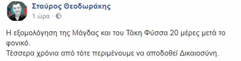 Ο Σταύρος Θεοδωράκης με ανάρτησή του στο Facebook, θυμάται την εξομολόγηση της Μάγδας και του Τάκη Φύσσα στους “Πρωταγωνιστές” και σημειώνει ότι ακόμα περιμένουμε να αποδοθεί Δικαιοσύνη τέσσερα χρόνια αργότερα.