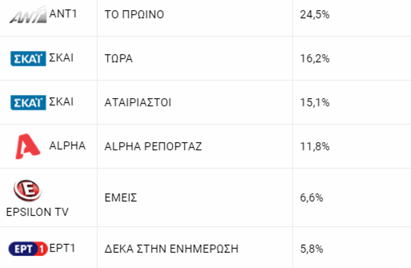 Συγκεκριμένα, το Πρωινό του ΑΝΤ1 σημείωσε στην πρεμιέρα του 24,5% στο γενικό σύνολο και 25,4 στο δυναμικό κοινό.