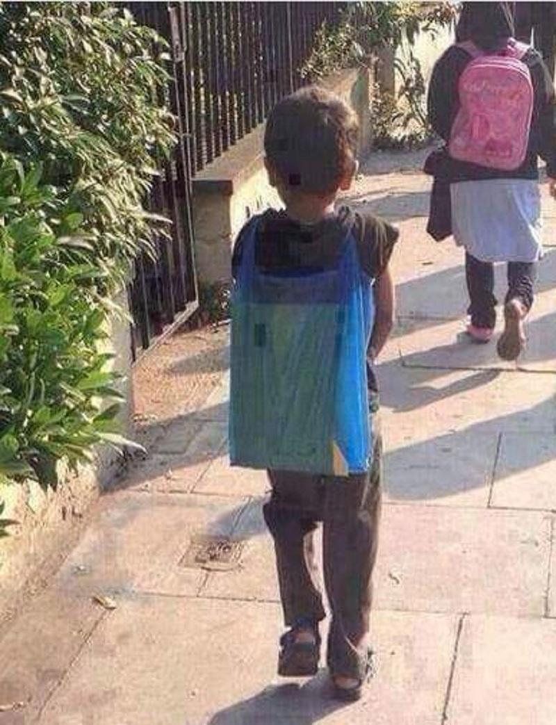 Η φωτογραφία βρίσκεται παντού στο facebook και την κάνουν share οι Έλληνες χρήστες. Δείχνει την πλάτη ενός παιδιού που πηγαίνει για μάθημα. Αντί όμως για τσάντα κουβαλάει μια πλαστική σακούλα και μέσα σε αυτή όλα του τα βιβλία.