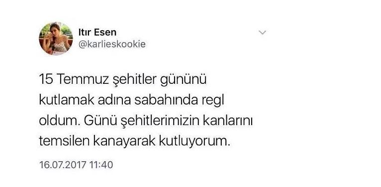 “Σήμερα το πρωί μου ήρθε η περίοδός μου για να τιμήσω την ημέρα των μαρτύρων της 15ης Ιουλίου. Τιμώ την ημέρα αυτή χύνοντας δι αντιπροσώπου το αίμα που έχυσαν οι μάρτυρές μας” έγραψε η Εσέν στον λογαριασμό της στις 16 Ιουλίου φέτος.