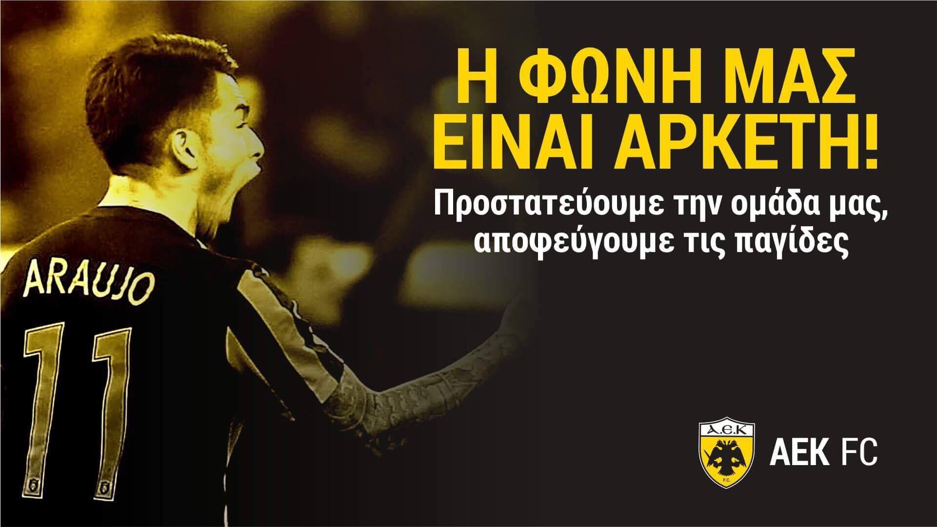 Με ανάρτηση στα social media, η ΠΑΕ ΑΕΚ έδωσε το σύνθημα για τη συμπεριφορά του κόσμου στις εξέδρες του Ολυμπιακού Στάδιου απόψε, στο μεγάλο παιχνίδι με τους Πειραιώτες και ζήτησε μονάχα φωνή και κανένα «παρατράγουδο».