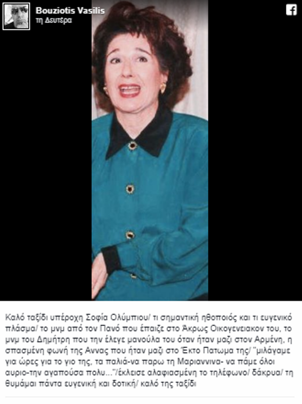 Μέσα από τον λογαριασμό του στο facebook, ο Βασίλης Μπουζιώτης αποχαιρετά τη Σοφία Ολυμπίου γράφοντας: «Καλό ταξίδι υπέροχη Σοφία Ολύμπιου/ τι σημαντική ηθοποιός και τι ευγενικό πλάσμα/ το μνμ από τον Πανό που έπαιζε στο Άκρως Οικογενειακον του, το μνμ του Δημήτρη που την έλεγε μανούλα του όταν ήταν μαζι στον Αρμένη, η σπασμένη φωνή της Άννας που ήταν μαζι στο Έκτο Πατωμα της/ «μιλάγαμε για ώρες για το γιο της, τα παλιά-να πάρω τη Μαριαννίνα- να πάμε όλοι αύριο-την αγαπούσα πολύ…»/έκλεισε αλαφιασμένη το τηλέφωνο/ δάκρυα/ τη θυμάμαι πάντα ευγενική και δοτική/ καλό της ταξίδι».