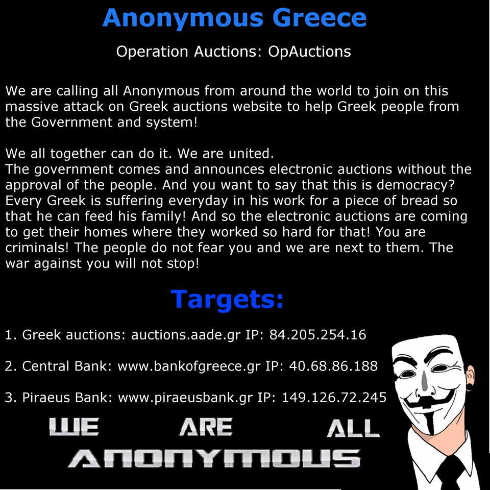 «Καλούμε όλους τους Anonymous απ’ όλο τον κόσμο να συμμετέχουν σε αυτή τη μαζική επίθεση ενάντια στις ιστοσελίδες που σχετίζονται με ελληνικούς πλειστηριασμούς για να βοηθήσουμε τους Έλληνες από την κυβέρνηση και το σύστημα.