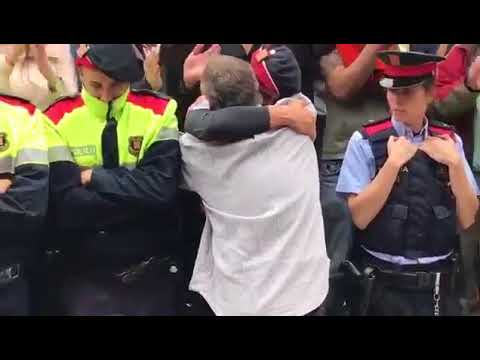 Στο βίντεο που ακολουθεί η άλλη όψη του ίδιου νομίσματος. Καταλανοί αστυνομικοί προστατεύουν υποστηρικτές του δημοψηφίσματος που τους επευφημούν και αγκαλιάζουν έναν από αυτούς.
