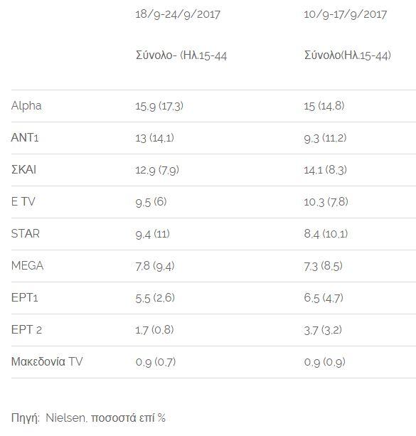 Τα ποσοστά του Ε TV παρέμειναν υψηλά αν και κατέγραψε μικρή πτώση, παραμένει ωστόσο στην 4η θέση, πάνω από το Star. Αξιοσημείωτη επίσης είναι η πτώση της ΕΡΤ 2.