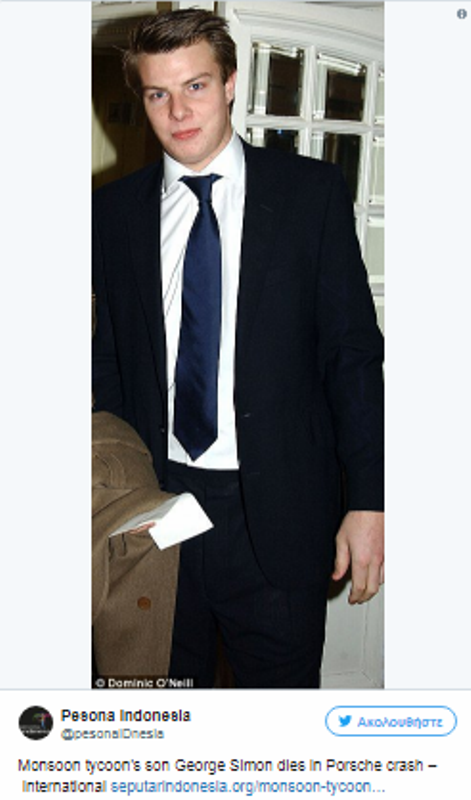 Την τελευταία του πνοή στην άσφαλτο άφησε ο γιος του μεγιστάνα της αυτοκρατορίας Monsoon και Accesorize. Ο 32χρονος George Simon είχε ένα φρικτό δυστύχημα με την πόρσε του στο West Sussex το Σάββατο, βυθίζοντας στη θλίψη την οικογένειά του.