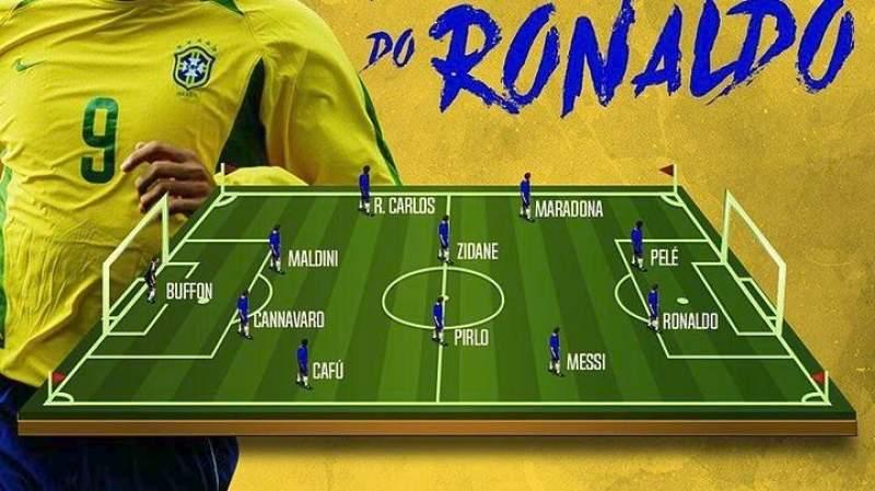 Η ιδανική του ενδεκάδα, περιλαμβάνει, τέσσερις Βραζιλιάνους, ισάριθμους Ιταλούς, δύο Αργεντινούς και έναν Γάλλο. Οι 11 που επέλεξε ο Ρονάλντο: Μπουφόν, Καφού, Μαλντίνι, Καναβάρο, Ρομπέρτο Κάρλος, Ζιντάν, Πίρλο, Μέσι, Μαραντόνα, Πελέ, Ρονάλντο.