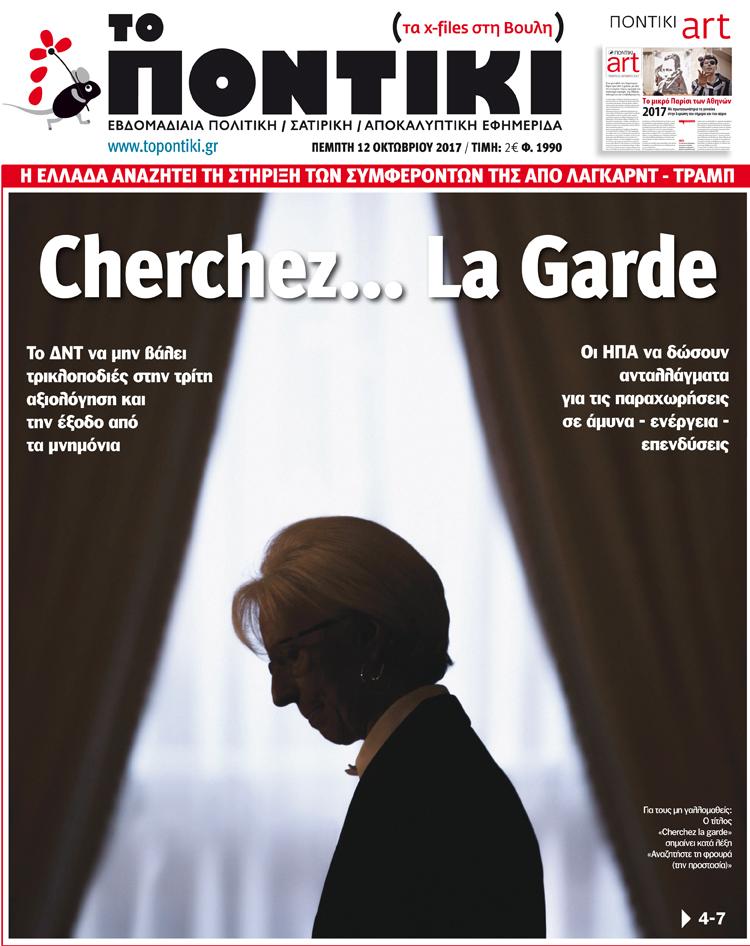 Με πρωτοσέλιδο τίτλο «Cherchez… La Garde» και αναλυτικό-αποκαλυπτικό ρεπορτάζ για την αναζήτηση της ελληνικής κυβέρνησης για στήριξη των συμφερόντων της από Κριστίν Λαγκάρντ και Ντόναλντ Τραμπ.