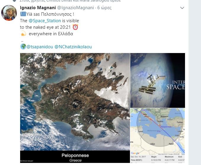 “Yia sou Πελοπόννησος” ήταν το μήνυμα του το πρωί της Κυριακής, το οποίο συνοδεύτηκε από μία φωτογραφία και λεπτομέρειες της τροχιάς που έκανε όταν βρέθηκε πάνω από την Ελλάδα.