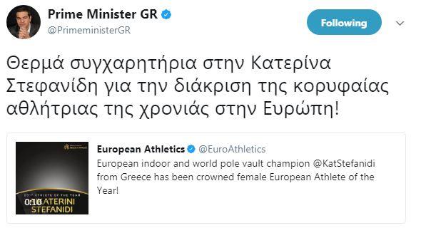 Τα εύσημα στην Κατερίνα Στεφανίδη, για την ανάδειξή της ως, η κορυφαία αθλήτρια στην Ευρώπη για το 2017, απένειμε o Αλέξης Τσίπρας από τις ΗΠΑ , μέσω twitter. Ο Ελληνας πρωθυπουργός έγραψε: «Θερμά συγχαρητήρια στην Κατερίνα Στεφανίδη για την διάκριση της κορυφαίας αθλήτριας της χρονιάς στην Ευρώπη!».