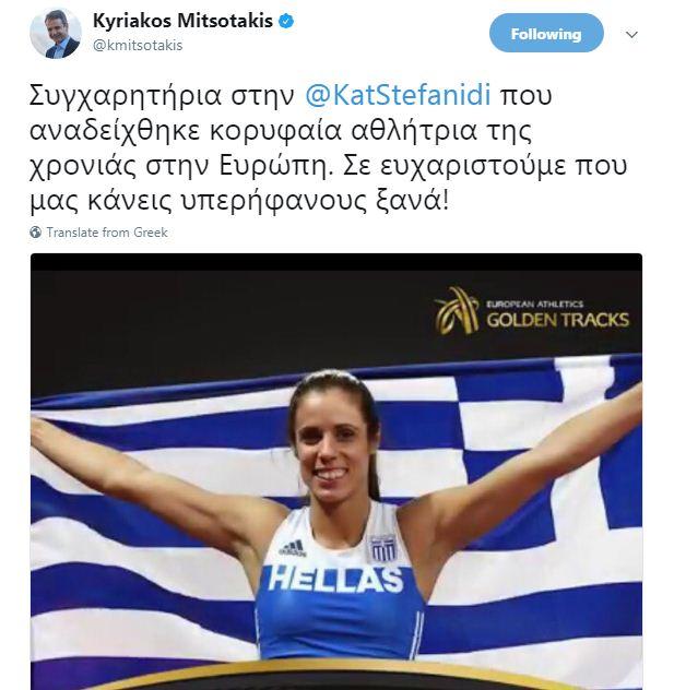 Ο πρόεδρος της Νέας Δημοκρατίας Κυριάκος Μητσοτάκης, συνεχάρη μέσω Twitter, την Κατερίνα Στεφανίδη για την ανάδειξή της ως, η κορυφαία αθλήτρια στην Ευρώπη για το 2017: «Συγχαρητήρια στην Κατερίνα Στεφανίδη που αναδείχθηκε κορυφαία αθλήτρια της χρονιάς στην Ευρώπη. Σε ευχαριστούμε που μας κάνεις υπερήφανους ξανά», έγραψε χαρακτηριστικά.