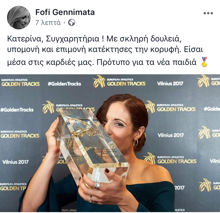 Επίσης η πρόεδρος της Δημοκρατικής Συμπαράταξης Φώφη Γεννηματά, έγραψε στο Twitter, για την Ελληνίδα πρωταθλήτρια : «Κατερίνα, Συγχαρητήρια ! Με σκληρή δουλειά, υπομονή και επιμονή κατέκτησες την κορυφή. Είσαι μέσα στις καρδιές μας. Πρότυπο για τα νέα παιδιά».