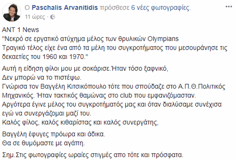Συγκλονισμένος εμφανίστηκε ο Πασχάλης λίγο μετά την τραγική είδηση θανάτου του Βαγγέλη Κιτσικόπουλου, ενός από τα βασικά στελέχη των Olympians. «Δεν μπορώ να το πιστέψω. Γνώρισα τον Βαγγέλη Κιτσικόπουλο τότε που σπούδαζε στο Α.Π.Θ.Πολιτικός Μηχανικός.