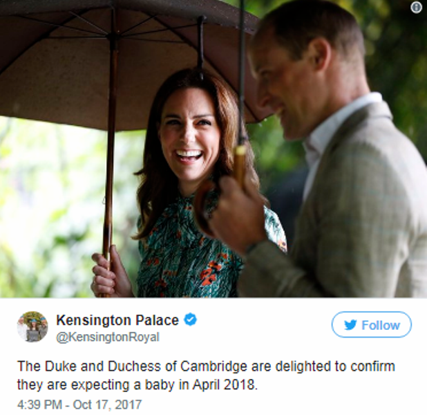 «Ο Δούκας και η Δούκισσα του Cambridge με χαρά επιβεβαιώνουν πως περιμένουν το τρίτο τους παιδάκι να έρθει στον κόσμο τον Απρίλιο του 2018», αναφέρει το tweet από τον επίσημο λογαριασμό του Παλατιού. Αυτό σημαίνει λοιπόν, πως η Kate είναι περίπου τριών μηνών έγκυος.