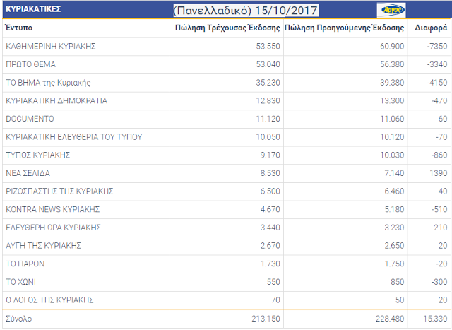 Αναλυτικά οι κυκλοφορίες, πανελλαδικά, των εφημερίδων την περασμένη Κυριακή 15/10/2017: