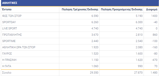 Η Real News δεν δημοσιοποιεί τις κυκλοφορίες της ενώ το ΕΘΝΟΣ προς το παρόν δεν βγάζει κυριακάτικο φύλλο. Η κυκλοφορία των αθλητικών εφημερίδων σημείωσε μικρή άνοδο και στο σύνολό τους πανελλαδικά πούλησαν περί τις 30.000 φύλλα.
