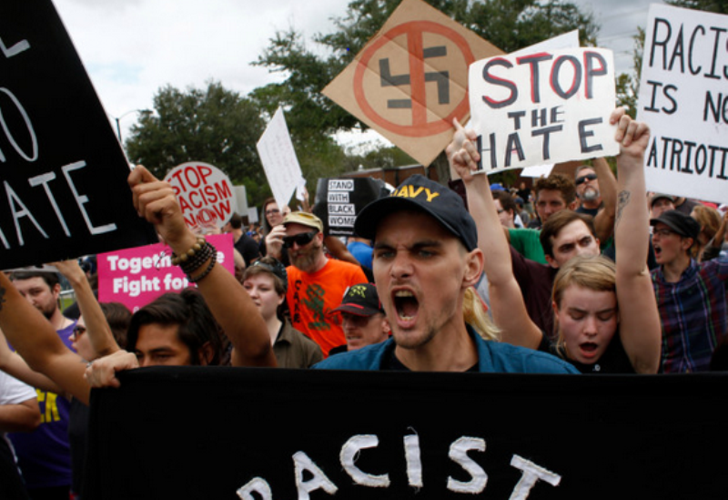 Στην πανεπιστημιούπολη του Γκέινσβιλ της Φλόριντα, μέλη αντιφασιστικών οργανώσεων πραγματοποίησαν ειρηνική διαδήλωση διαμαρτυρίας, επειδή μέσα στο πανεπιστήμιο μιλούσε σε εκδήλωση ο ακροδεξιός Ρίτσαρντ Σπένσερ. Απέναντι τους παρατάχθηκαν ως συνήθως τα «μπρατσωμένα παιδιά», οι νεοναζί που δεν ξεπερνούσαν τους 300 και άρχισαν να προκαλούν και να υβρίζουν τους διαδηλωτές.