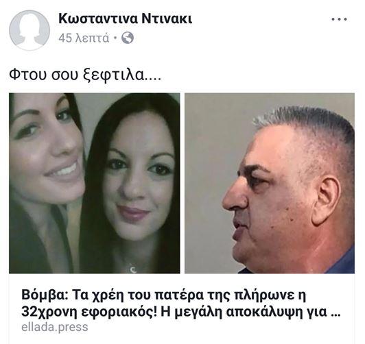 Σε νέο της μήνυμα στο Facebook, η Κωνσταντίνα καταφέρεται εναντίον του πατέρα τους γράφοντας «φτου σου ξεφτίλα» και κοινοποιεί είδηση που αφορά στην αδερφή της και έχει τίτλο: «Βόμβα: Τα χρέη του πατέρα της πλήρωνε η 32χρονη εφοριακός! Η μεγάλη αποκάλυψη για τις σχέσεις της οικογένειας που ανατρέπει τα δεδομένα!».