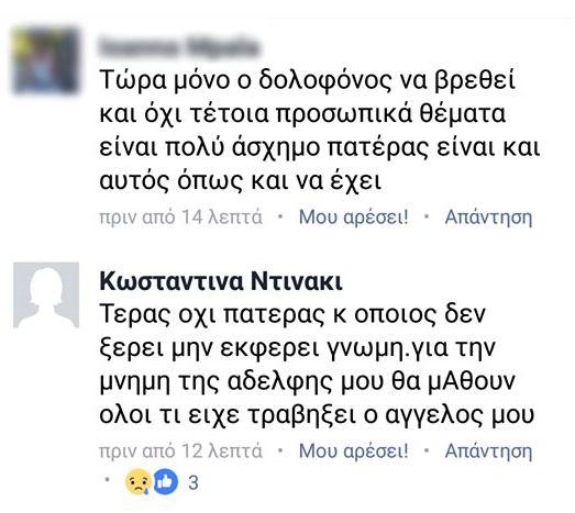 Σε σχόλιο «φίλου» της: «Τώρα μόνο ο δολοφόνος να βρεθεί και όχι τέτοια προσωπικά θέματα είναι πολύ άσχημο πατέρας είναι και αυτός όπως και να έχει», η νεαρή κοπέλα απαντά: «Τέρας όχι πατέρας κ όποιος δεν ξέρει μην εκφέρει γνώμη. Για τη μνήμη της αδελφής μου θα μάθουν όλοι τι είχε τραβήξει ο άγγελός μου».