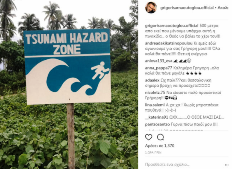 Όμως, την Τρίτη με νέα του ανάρτηση ο Γρηγόρης Αρναούτογλου, δείχνει την έντονη ανησυχία του, καθώς σε πολύ κοντινή τοποθεσία, μόλις στα 500 μέτρα, βρίσκεται πινακίδα από τις τοπικές Αρχές, η οποία προειδοποιεί για τσουνάμι. Ο παρουσιαστής ανήρτησε την εν λόγω πινακίδα, γράφοντας στη λεζάντα: