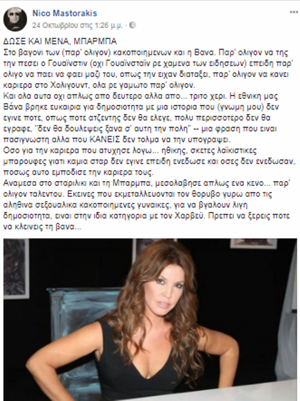 Αμφισβητώντας τον ισχυρισμό της Βάνας Μπάρμπα ότι παρ’ολίγον να αποτελέσει και η ίδια ένα από τα θύματα του Γουαϊνστιν, ο Νίκος Μαστοράκης είχε αναφερθεί εκτενώς -με μια μακροσκελή του ανάρτηση στο facebook- στο θέμα, με μπόλικη δόση ειρωνείας, λέγοντας τα εξής: