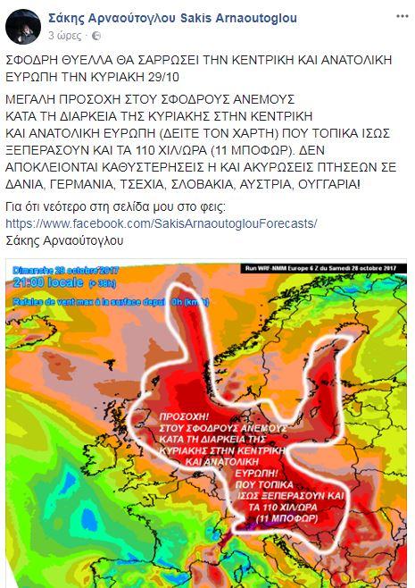 Για σφοδρή θύελλα που θα σαρώσει την Κυριακή την κεντρική και ανατολική Ευρώπη προειδοποιεί μέσω της προσωπικής του σελίδας στο Facebook o μετεωρολόγος Σάκης Αρναούτογλου.