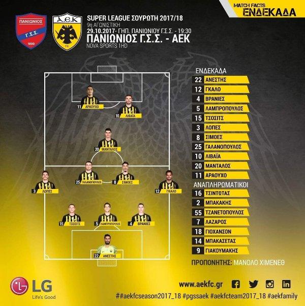 Πριν από λίγα λεπτά κλείδωσε η ενδεκάδα της ΑΕΚ για την αναμέτρηση απέναντι στον Πανιώνιο. Για το ματς της Νέας Σμύρνης ο Μανόλο Χιμένεθ θα κατεβάσει την ομάδα του με διάταξη 3-5-2.