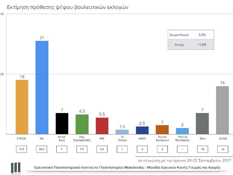 Συγκεκριμένα, στη δημοσκόπηση η ΝΔ συγκεντρώνει 31% στην πρόθεση ψήφου έναντι 30,5% στη σφυγμομέτρηση του Σεπτεμβρίου, ο ΣΥΡΙΖΑ σημειώνει 18% έναντι 17,5%, η ΧΑ παραμένει σταθερή στο 7%, η ΔΗΣΥ καταγράφει 6,5% έναντι 7,5%, το ΚΚΕ 5,5% έναντι 6,5%, Το Ποτάμι 1,5% έναντι 1%, οι ΑΝΕΛ 2,5% έναντι 2% η Ένωση Κεντρώων 3% έναντι 2%, η Πλεύση Ελευθερίας 2% (χωρίς ποσοστό στο προηγούμενο γκάλοπ), “άλλο κόμμα”απαντά το 7% των ερωτηθέντων, 16% δηλώνει δεν ξέρω/ δεν απαντώ, άκυρο/ λευκό θα ψήφιζε το 5,5% ενώ 11% θα απείχε από την εκλογική αναμέτρηση.