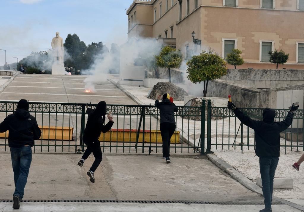 Μικροεπεισόδια σημειώθηκαν έξω από το προαύλιο της Βουλής στο Σύνταγμα όταν ομάδα αγνώστων έκανε ρίψη καπνογόνων, φωτοβολίδων και βομβών μολότοφ προς τις αστυνομικές δυνάμεις οι οποίες «απάντησαν» κάνοντας χρήση χημικών.