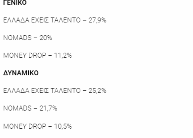 Σύμφωνα με τους πίνακες της Nielsen, το Ταλέντο είναι ο νικητής της βραδιάς, καθώς κατάφερε να αποκτήσει διαφορά ασφαλείας από το Nomads που ακολούθησε. Όσο για το Money Drop, δυσκολεύτηκε αρκετά…