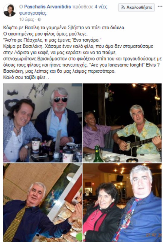 Κρίμα ρε Βασιλάκη. Χάσαμε έναν καλό φίλο, που άμα δεν σταματούσαμε στην Λάρισα για καφέ, να μας κεράσει και να τα πούμε, στεναχωριότανε.Βρισκόμασταν στο φιλόξενο σπίτι του και τραγουδούσαμε με όλους τους φίλους και ήτανε πανευτυχής. ”Αre you lonesome tonght” Elvis ?