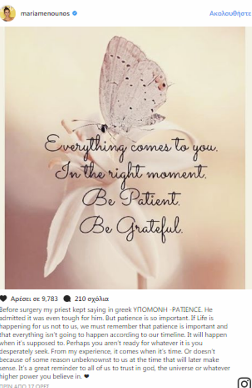 Μετά το χειρουργείο και την πλήρη ανάρρωσή της, η Μαρία Μενούνος έχει επιστρέψει στην καθημερινότητά της και μέσα από ένα ιδιαίτερα συγκινητικό μήνυμα προσπαθεί τώρα να δώσει κουράγιο σε όσους το χρειάζονται! “Πριν την επέμβαση ο ιερέας μου, έλεγε συνεχώς στα ελληνικά τη λέξη “Υπομονή”. Και παραδέχτηκε πως κάτι τέτοιο ήταν δύσκολο ακόμη και για τον ίδιο. Αν η ζωή συμβαίνει σε εμάς και όχι για εμάς, εμείς πρέπει να θυμόμαστε ότι η υπομονή είναι σημαντική και ότι δεν θα γίνουν όλα σύμφωνα με το πρόγραμμά μας. Θα συμβούν όταν πρέπει να συμβούν. Πιθανότατα να μην είσαι έτοιμος όταν έρθει σε εσένα μια ασθένεια. Από την εμπειρία μου, πιστεύω ότι έρχεται, όταν πρέπει. Ή δεν συμβαίνει για κάποιους άγνωστους σε εμάς λόγους, που αργότερα όμως θα αποδειχτεί πως έχουν νόημα. Είναι μια σπουδαία υπενθύμιση σε όλους μας να εμπιστευτούμε το Θεό, το σύμπαν, ή όποια δύναμη πιστεύει ο καθένας ό,τι υπάρχει”!