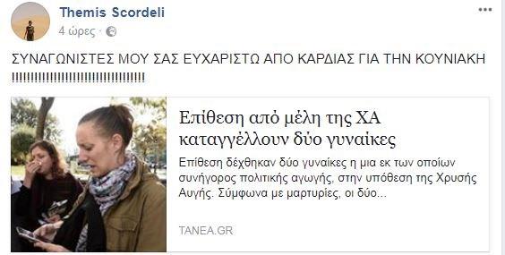 Πρόκειται για τη Θέμιδα Σκορδέλη, πρώην υποψήφια βουλευτή της οργάνωσης, η οποία έχει καταδικαστεί σε 3ετή φυλάκιση με αναστολή για επιθέσεις κατά μεταναστών στον Άγιο Παντελεήμονα. Η Θέμις Σκορδέλη, λοιπόν, έσπευσε να συγχαρεί τα μέλη της Χρυσής Αυγής για την πράξη τους, γράφοντας στον προσωπικό της λογαριασμό στο Facebook «συναγωνιστές μου σας ευχαριστώ από καρδιάς για την Κουνιάκη».