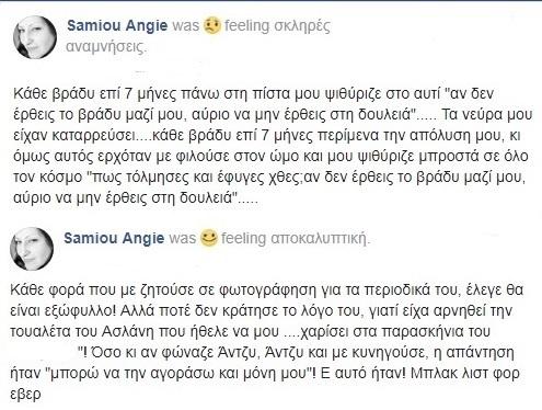 Συγκεκριμένα, η Άντζυ Σαμίου έγραψε: «Κάθε βράδυ επί επτά μήνες πάνω στην πίστα μου ψιθύριζε στο αυτί: “Αν δεν έρθεις το βράδυ μαζί μου, αύριο να μην έρθεις στη δουλειά”… Τα νεύρα μου είχαν καταρρεύσει… Κάθε βράδυ επί επτά μήνες περίμενα την απόλυσή μου, κι όμως αυτός ερχόταν, με φιλούσε στον ώμο και μου ψιθύριζε μπροστά σε όλο τον κόσμο: “Πώς τόλμησες και έφυγες χθες; Αν δεν έρθεις το βράδυ μαζί μου, αύριο να μην έρθεις στη δουλειά”…».