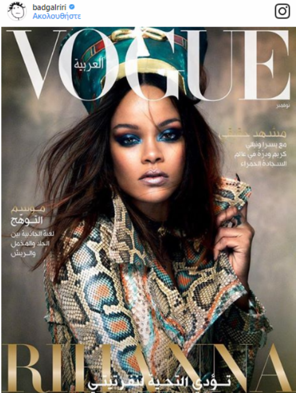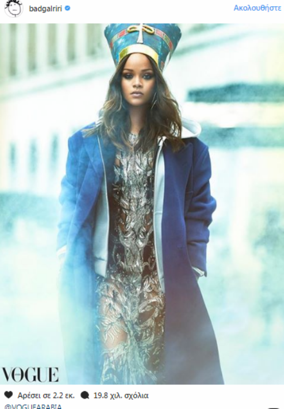Το εξώφυλλο της αραβικής Vogue για το τεύχος Νοεμβρίου κυκλοφορεί με τη Ριάνα ως βασίλισσα Νεφερτίτη. Η γνωστή τραγουδίστρια της ποπ μουσικής μοιράστηκε μάλιστα με τους διαδικτυακούς της φίλους τρεις σχετικές φωτογραφίες της στο προφίλ της στο Instagram.