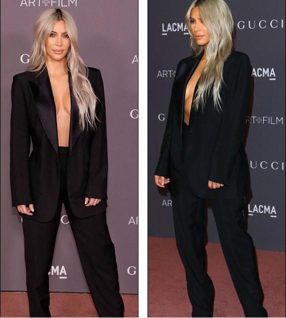 Η σύζυγος του Κάνιε Γουέστ επέλεξε να φορέσει ένα βίντατζ κουστούμι του οίκου Gucci, όμως… φόρεσε μόνο αυτό. Ούτε μπλούζα, ούτε σουτιέν φορούσε μέσα από το σακάκι, το οποίο μάλιστα είχε αφήσει ανοιχτό.