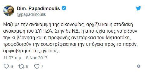 Για ανεπάρκεια του προέδρου της ΝΔ και υπόγεια αμφισβήτηση της ηγεσίας της κάνει λόγο ο Δημήτρης Παπαδημούλης.
