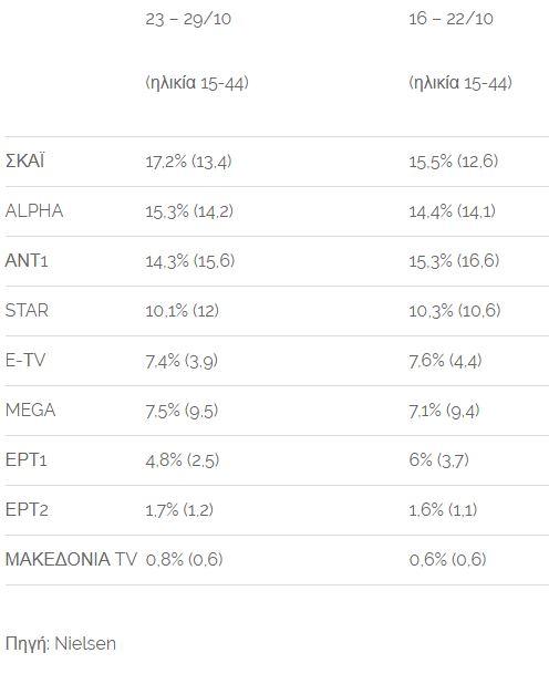 Η σχετική άνοδος του Alpha έφερε τελικά τον ΑΝΤ1 στην τρίτη θέση, ενώ αυξήθηκε κάπως το ποσοστό του Mega και μειώθηκε εκείνο της ΕΡΤ1.