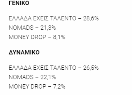 Το Nomads μετακινήθηκε τις Κυριακές για να «χτυπήσει» το Ελλάδα Έχεις Ταλέντο, φαίνεται όμως ότι το talent show του ΣΚΑΪ έχει… ένα ταλέντο να ξεπερνά τα εμπόδια στο δρόμο για την κορυφή. Το βράδυ της Κυριακής, η τηλεθέαση πήρε κυρίως το μέρος του ΣΚΑΪ και ο ΑΝΤ1 ακολούθησε σε μικρή απόσταση. Για το Money Drop στο Star, από την άλλη, τα πράγματα είναι αρκετά δύσκολα…