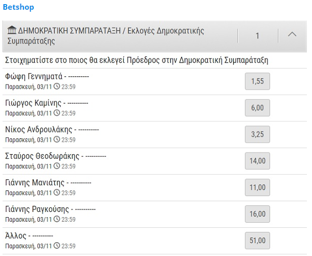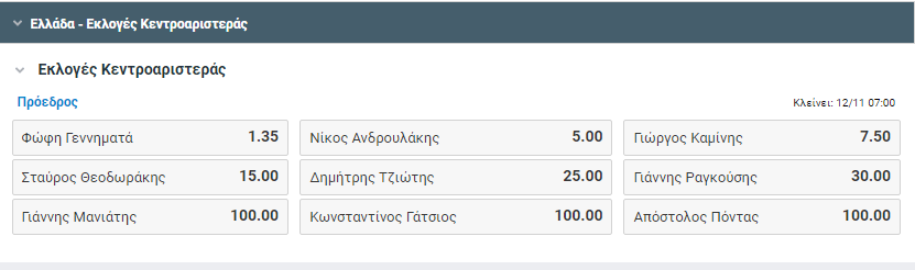 Οι πρώτες εκτιμήσεις των στοιχηματικών εταιρειών για τις εκλογές του νέου φορέα της Κεντροαριστεράς δείχνουν ότι προβάδισμα έχουν οι Γεννηματά, Θεοδωράκης ή ο Καμίνης για την πρώτη θέση, ενώ στη δεύτερη εμφανίζεται ο Ανδρουλάκης.