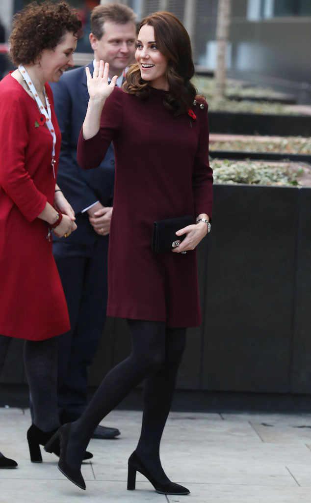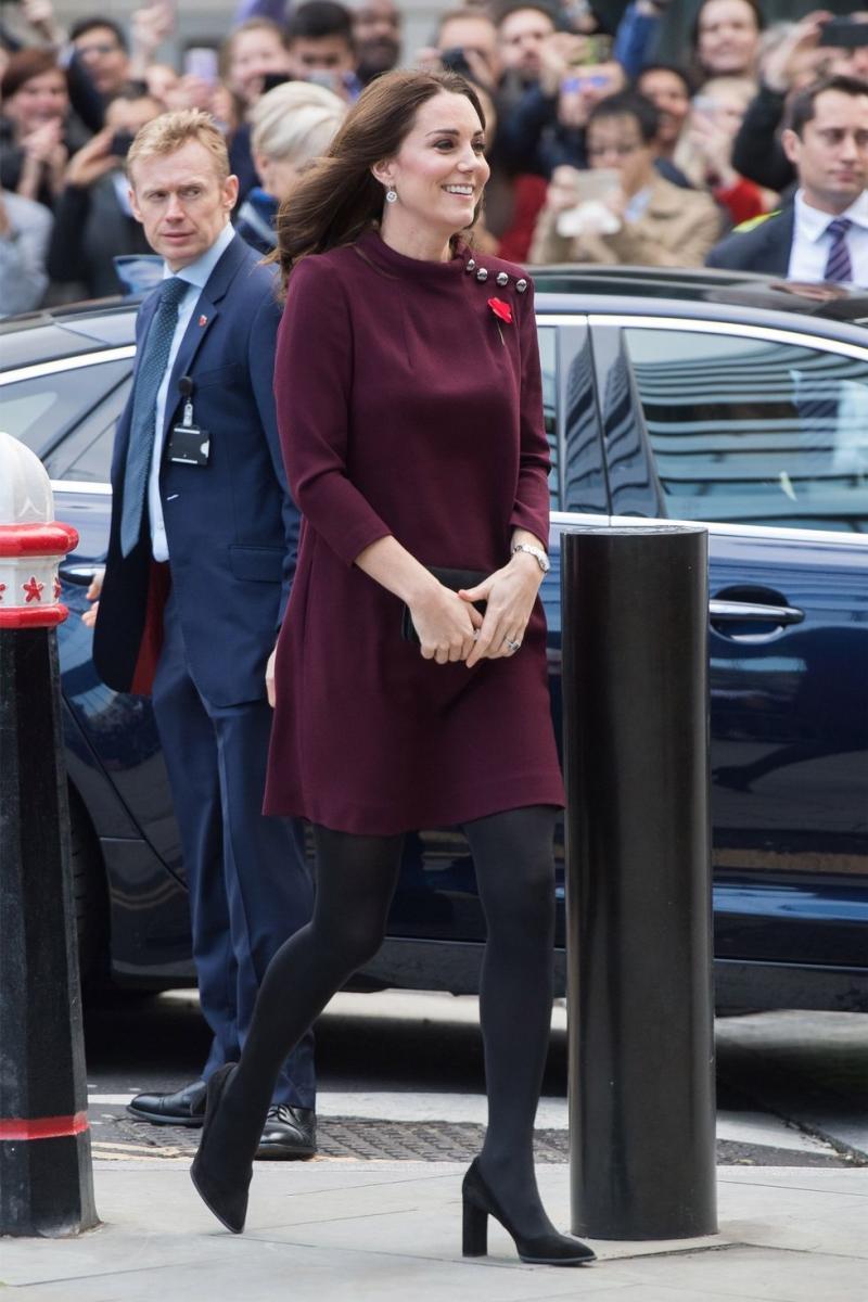 Φυσικά, αυτό που όλοι σχολίασαν και πάλι ήταν το φόρεμα που επέλεξε να φορέσει (ένα μίνι δαμασκηνί φόρεμα σε στυλ mod) το οποίο συνδύασε με μαύρα αξεσουάρ, καλσόν και γόβες σε αυστηρή γραμμή, με αποτέλεσμα να είναι σχεδόν αδύνατο να δει κανείς πως είναι έγκυος.
