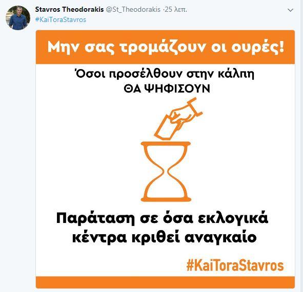Μην σας τρομάζουν οι ουρές! Όσοι προσέλθουν στην κάλπη, ΘΑ ΨΗΦΙΣΟΥΝ. Παράταση σε όσα εκλογικά κέντρα κριθεί αναγκαίο», έγραψε χαρακτηριστικά ο υποψήφιος για την ηγεσία της Κεντροαριστεράς και επικεφαλής του Ποταμιού.