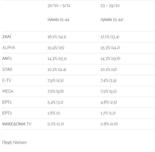 Χωρίς ιδιαίτερες αλλαγές η μέση τηλεθέαση την περασμένη εβδομάδα, με τον ΣΚΑΪ να κρατά την πρώτη θέση, με ελαφρά πτώση της θεαματικότητάς του.