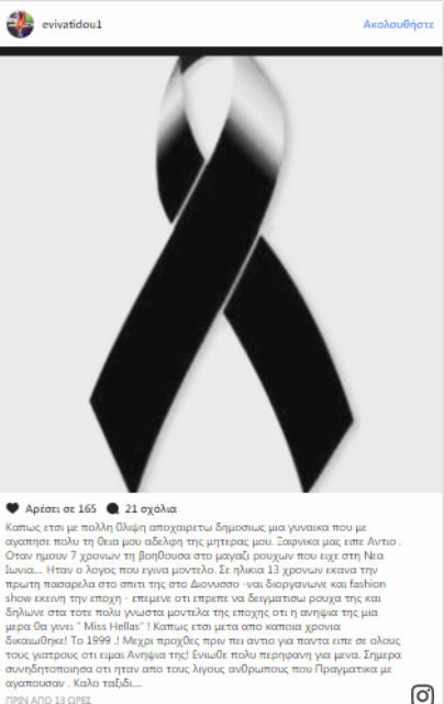 «Κάπως έτσι με πολλή θλίψη αποχαιρετώ δημοσίως μια γυναίκα που με αγάπησε πολύ τη θεία μου αδελφή της μητέρας μου. Ξαφνικά μας είπε Αντίο . Όταν ήμουν 7 χρόνων τη βοηθούσα στο μαγαζί ρούχων που είχε στη Νέα Ιωνία… Ήταν ο λόγος που έγινα μοντέλο. Σε ηλικία 13 χρόνων έκανα την πρώτη πασαρέλα στο σπίτι της στο Διόνυσσο -ναι διοργάνωνε και fashion show εκείνη την εποχή – επέμενε ότι έπρεπε να δειγματίσω ρούχα της και δήλωνε στα τότε πολύ γνωστά μοντέλα της εποχής ότι η ανιψιά της μια ήμερα θα γίνει ” Μiss Hellas” ! Κάπως έτσι μετά από κάποια χρόνια δικαιώθηκε! Το 1999 ! Μέχρι προχθές πριν πει αντίο για πάντα είπε σε όλους τους γιατρούς ότι είμαι Ανιψιά της! Ένιωθε πολύ περήφανη για μένα. Σήμερα συνειδητοποίησα ότι ήταν από τους λίγους ανθρώπους που πραγματικά με αγαπούσαν. Καλό ταξίδι…», έγραψε στο Facebook.