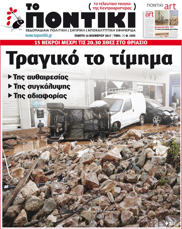 Με πρωτοσέλιδο τίτλο «Τραγικό το τίμημα» και αναλυτικό-αποκαλυπτικό ρεπορτάζ για τη θεομηνία που έπληξε τη Δυτική Αττική.