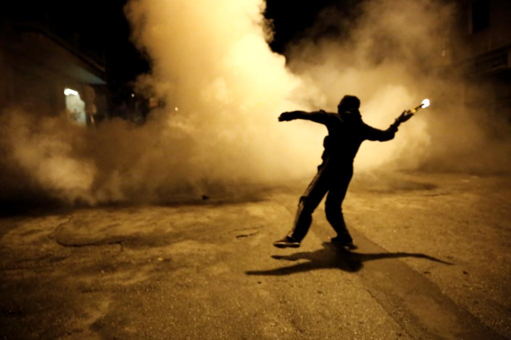 Οι αστυνομικοί απαντούν με χρήση δακρυγόνων και χειροβομβίδες κρότου λάμψης, ενώ πάνω από την περιοχή πετάει συνεχώς ελικόπτερο της Ελληνικής Αστυνομίας.
