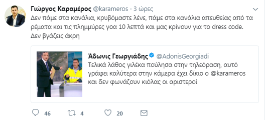 «Τελικά λάθος γιλέκα πούλησα στην τηλεόραση, αυτό γράφει καλύτερα στην κάμερα», έγραψε στο tweet του ο κύριος Γεωργιάδης, συμπληρώνοντας «και δεν φωνάζουν κιόλας οι αριστεροί», έγραψε ο αντιπρόεδρος της Νέας Δημοκρατίας Άδωνις Γεωργιάδης.