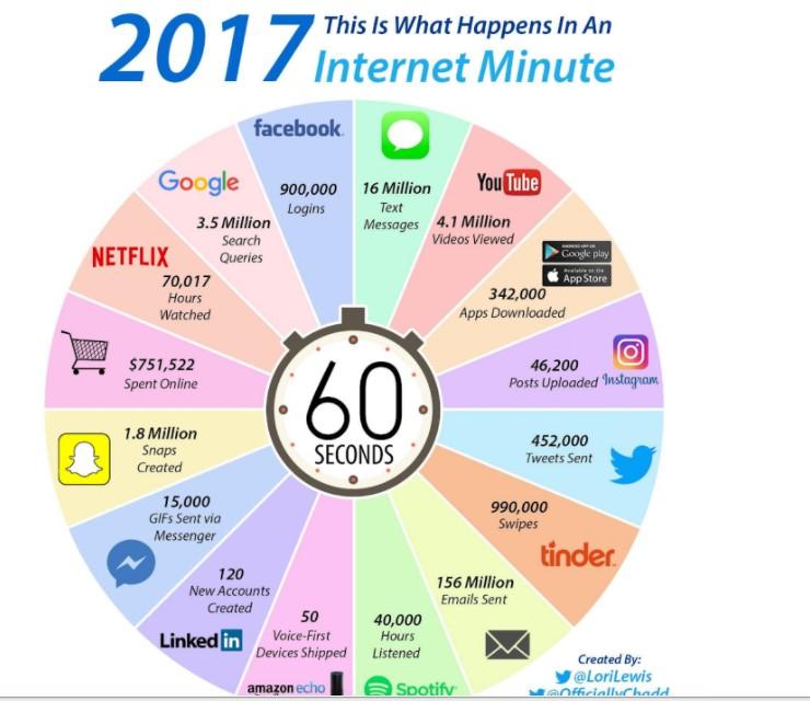 Παράλληλα, μέσα σε 60 δευτερόλεπτα, στέλνονται παγκοσμίως 156 εκατομμύρια e-mails, ενώ μέσα στον ίδιο χρόνο οι χρήστες του instagmam αναρτούν κάτι παραπάνω από 46.000 φωτογραφίες.