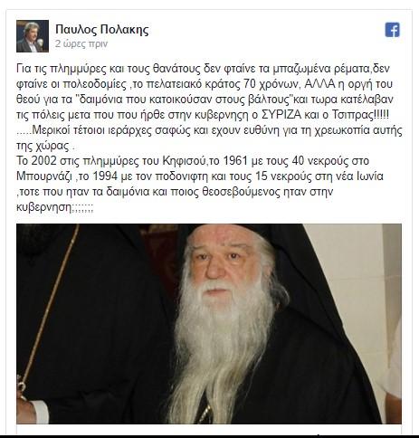 «Για τις πλημμύρες και τους θανάτους δεν φταίνε τα μπαζωμένα ρέματα, δεν φταίνε οι πολεοδομίες, το πελατειακό κράτος 70 χρόνων, ΑΛΛΑ η οργή του θεού για τα “δαιμόνια που κατοικούσαν στους βάλτους” και τώρα κατέλαβαν τις πόλεις μετα που που ήρθε στην κυβέρνηση ο ΣΥΡΙΖΑ και ο Τσιπρας!!!!!