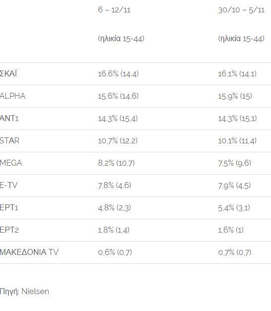 Η τηλεόραση του ΣΚΑΪ με τα ριάλιτι διατήρησε για δεύτερη συνεχή εβδομάδα την πρώτη θέση, ενώ ο ΑΝΤ1 πιέζεται τόσο από τον πρώτο ΣΚΑΪ όσο και από τον Alpha, που παρά τη μικρή πτώση παραμένει στη δεύτερη θέση.